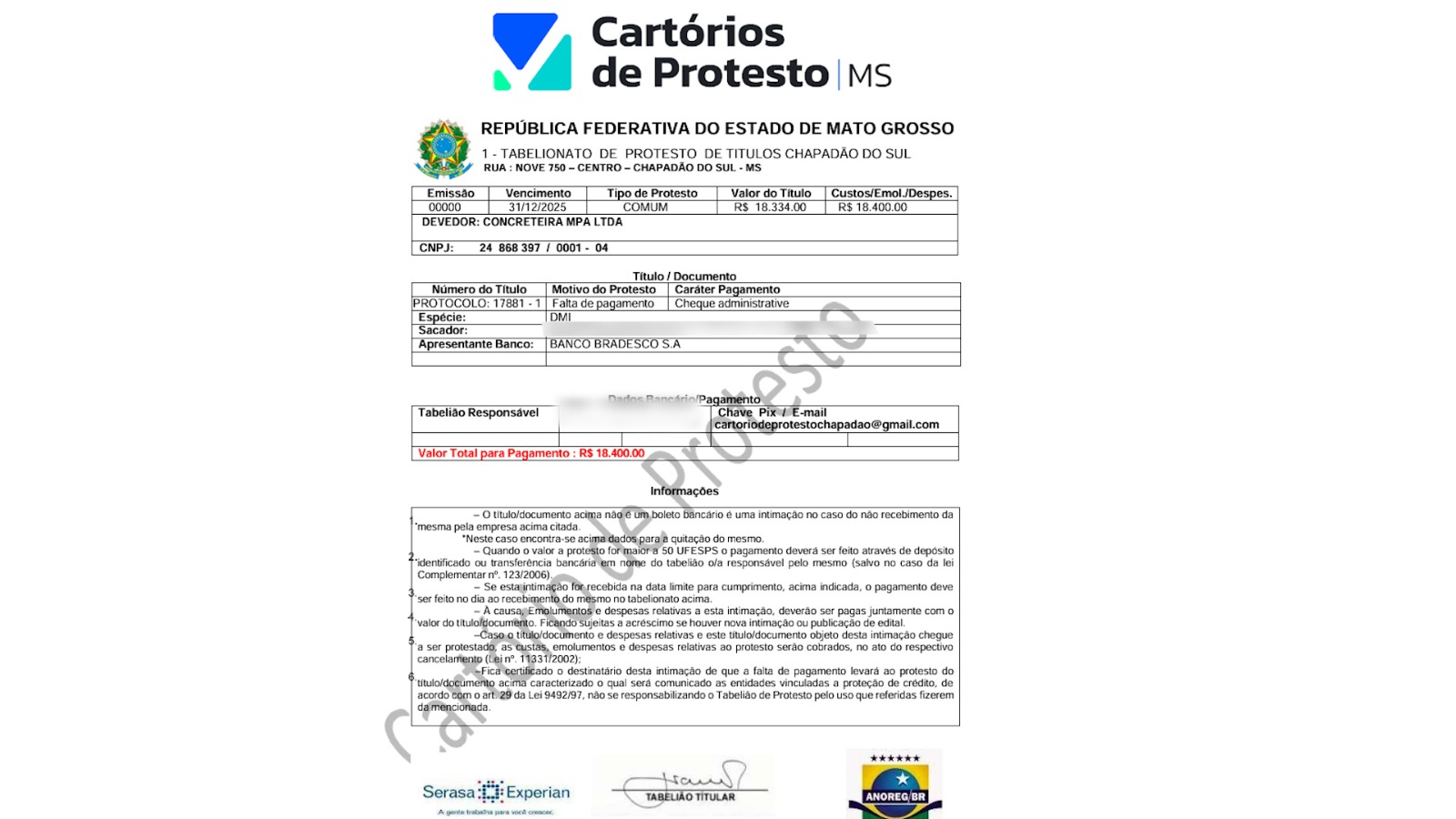 - Em caso de intimação, confirme a veracidade da dívida pelo site www.pesquisaprotesto.com.br ou entre em contato com o Cartório de Protesto da sua cidade pelo número (67) 3326-3712.